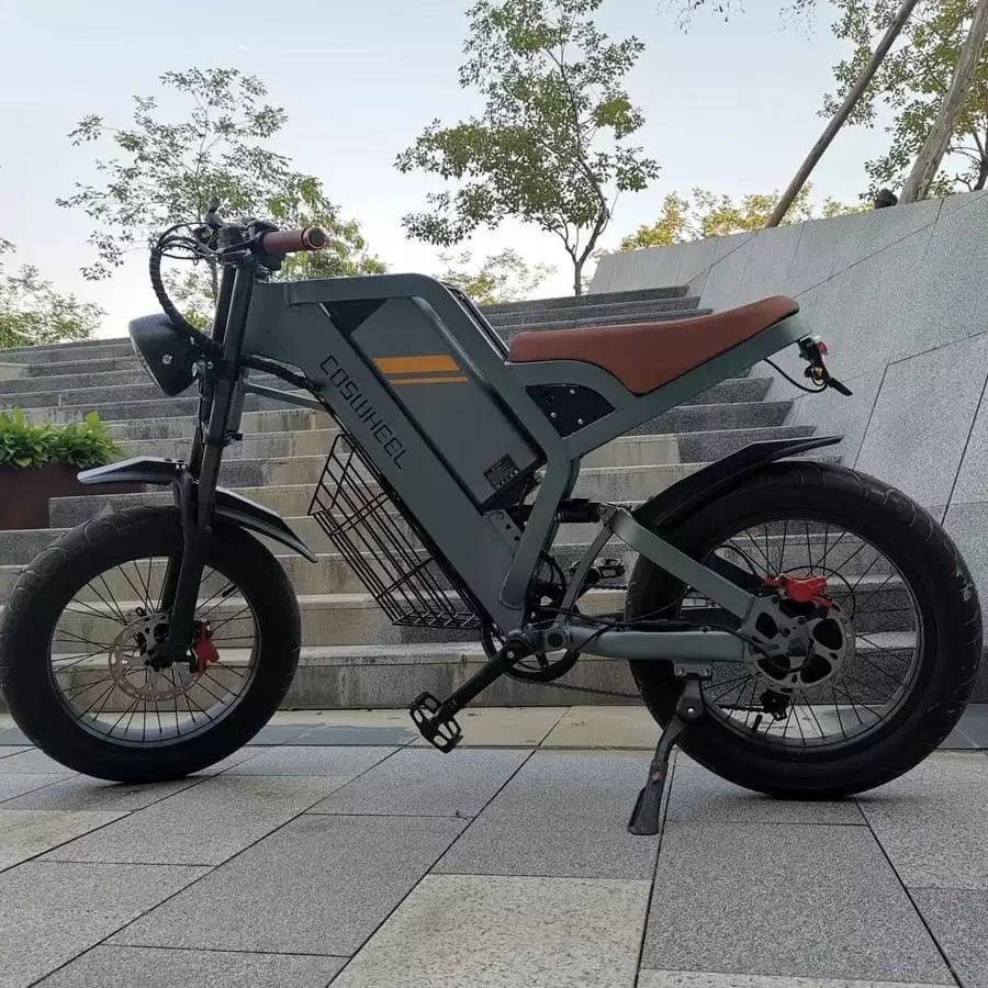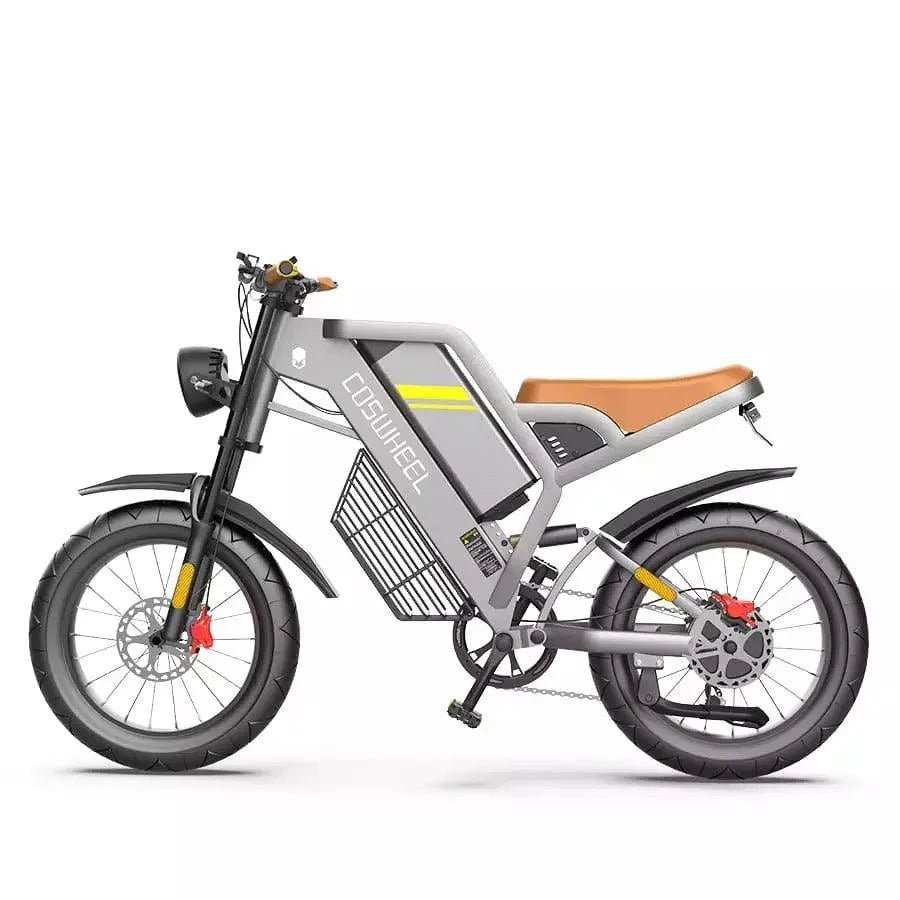 COSWHEEL GT20 Electric Bike designed with a motorcycle-inspired aesthetic and engineered for ultimate performance and comfort. Available in sleek Grey with black wheels, and the bike comes with a battery and a charger.