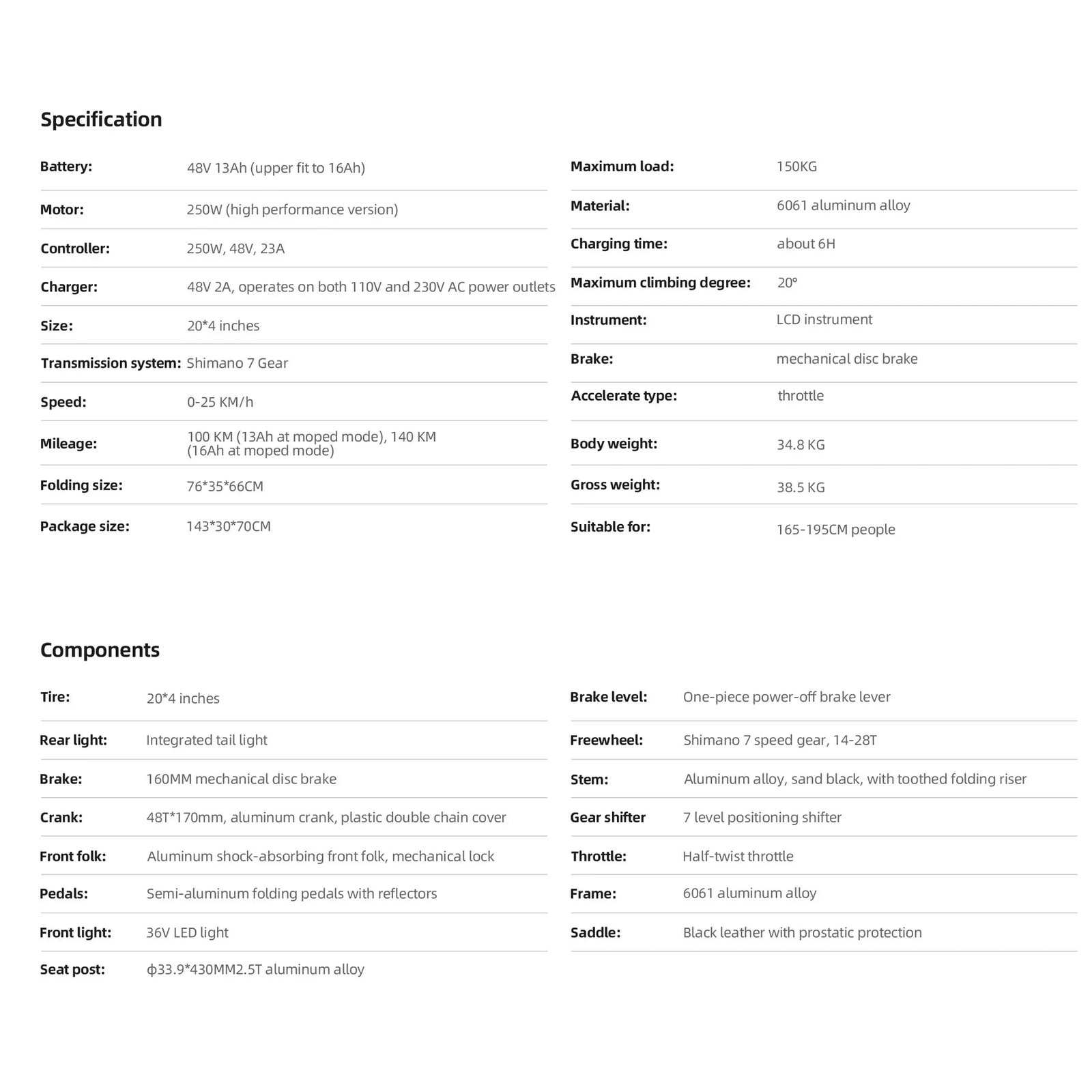 - 48V 13Ah Lithium Removable Battery (upper fit to 16Ah)
